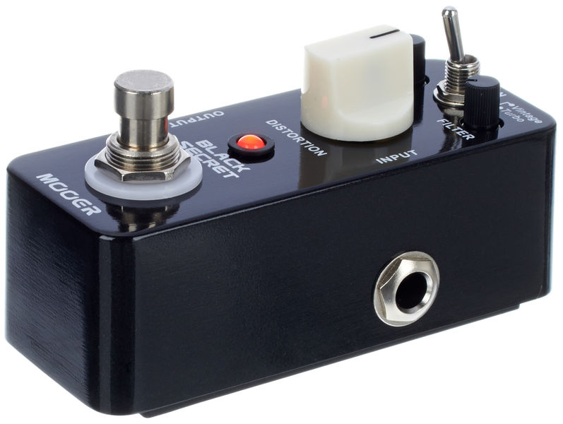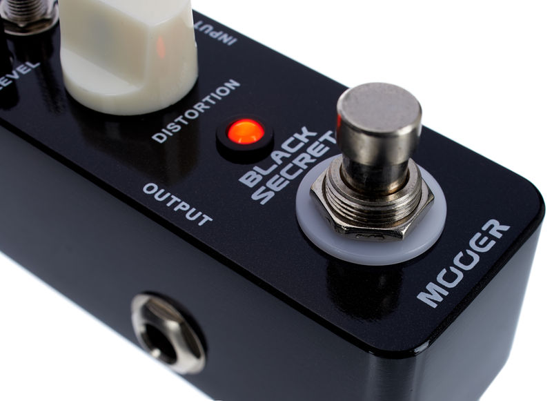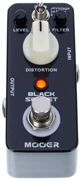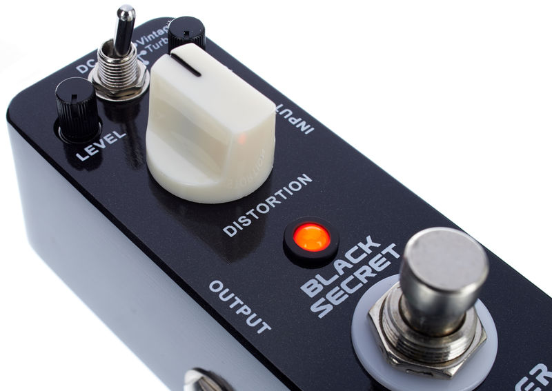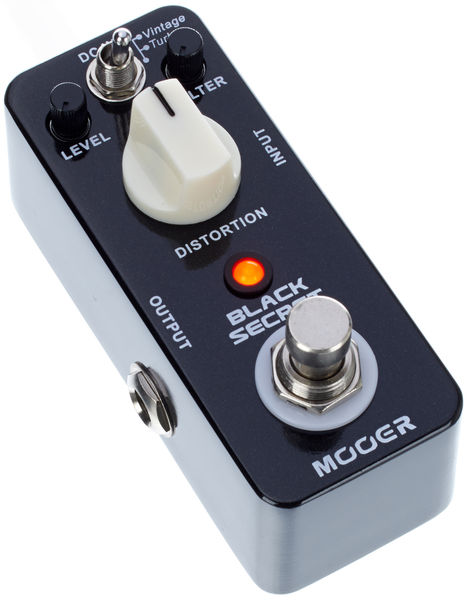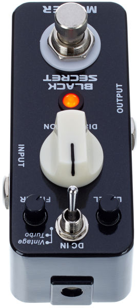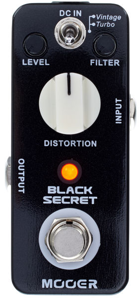 Mooer Black Secret, Electric guitar effects pedal, Distortion, Control for: Distortion, Level and Filter, Vintage/Turbo toggle, Jack in- and output, LED Status, True Bypass, Requires 9V DC power supply (not included), Dimensions (LxWxH): 93.5 x 42 x 52 mm, Weight: 160 g