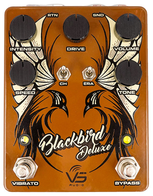 " VS Audio Blackbird Deluxe Overdrive, Effect Pedal for Electric Guitars, Medium gain overdrive & bias tremolo, ""Era"" toggle switch for switching between blackface '65 and brownface '63 style sound, Bypass footswitch with double function (hold for gain switching), ""CH"" switch for switching between normal and bright channel, Integrated passive effect path (send / return), Controls: Volume, drive, tone, intensity, speed, Switch: Era, Ch, LED: Effect on, vibrato on, Footswitch: Vibrato, effect bypass, Connectors: Input: 6.3 mm jack, output: 6.3 mm jack, Effect send, effect return, Mains adapter connection: Hollow female plug 5.5 x 2.1 mm, negative pole inside, Power consumption: 58 mA mA, Power supply with a 9-18 V DC mains adapter, (not included), Matching optional mains adapter: Article no. #409939# (not included), True bypass, Dimensions (W x D x H): 94 x 119 x 34 mm, Weight: 600 g, Handmade in Greece@+*Note:* Battery operation is not supported.@+@+"
