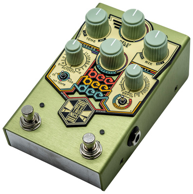 Beetronics Bee Bee Dee, Effect Pedal for Electric Guitar, Analogue delay with three unique modes, BBD (Bucket Brigade Device) technology with innovative digital control, but completely analogue audio path, Classic Mode: Authentic BBD tone with smooth sine wave modulation, Lo-Fi Mode: Dark repetitions with irregular LFO changing the delay time and sound. Echoes drift/fade between light and dark, Pitch Mode: Echoes change in pitch, creating harmonies, rhythmic patterns and unexpected textures. The delay becomes a musical instrument, Three distinct expression modes, Tap: Determine the tempo in an instant, 2X: Halves the delay time, pitching everything up or down an octave depending on the output setting, Mod: The footswitch turns modulation on/off, either permanently or temporarily. Tap briefly for permanent switching or hold for expressive jumps and returns, Control: Tone, Delay Time, Mix, Activity, Depth, 3-way mini switch for switching between delay modes, 3-way mini switch for switching between expression modes, Footswitch (soft click): bypass, expression, True bypass, Input and output: 6.3 mm jack, Power supply (not included): 9 V DC (centre negative), Dimensions (L x W x H): 140 x 102 x 70 mm, Weight: 455 g, Made in USA