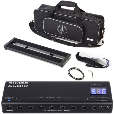 Harley Benton SpaceShip 50C Set@+*Bundle offer comprising*, Swiff Audio P200 Effector Adjustable Power@+*Multi Power Supply for Effect Pedals*, Fully isolated outlets that do not interfere with each other, Compact design, easy to transport, Equipped with 15V 1A USB output, 7DC 9V outputs with a maximum of 100 mA, 1 Adjustable voltage output (DC 4V-9V) with 500 mA, Stable current for 4-9V tube effects, Multi-interface output, Separate short-circuit protection on each port, Efficient protective design with heat-resistant aluminium housing, Output power: 80 watts, Colour: Black, Harley Benton SpaceShip 50C@+*Pedal Board*, Compact and lightweight, Sturdy, powder-coated aluminium frame, Carpet-covered, Simple power supply installation underneath the frame, Dimensions (H x W x D): 35 x 500 x 135 mm, Weight: 0.65 kg, Includes padded gig bag with accessory bag and shoulder strap, 1.5 m hook-and-loop tape (male), and 2 rubber bands for mains adapter installation