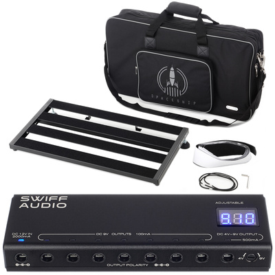 Harley Benton SpaceShip 60 Set@+*Bundle offer comprising*, Harley Benton SpaceShip 60@+*Pedalboard*, Adjustable and lightweight, Rugged powder coated aluminium frame, Carpet covered, Adjustable height and tilt, Easy power supply installation under the frame, Dimensions (H x W x D): 70/85 x 600 x 305 mm, Weight: 1.54 kg, Includes padded gigbag with accessory bag and shoulder strap, 3 m hook and loop fastener (male) and 2 rubber bands for power supply installation, Swiff Audio P200 Effector Adjustable Power@+*Multi Power Supply for Effect Pedals*, Fully isolated outlets that do not interfere with each other, Compact design, easy to transport, Equipped with 15V 1A USB output, 7DC 9V outputs with a maximum of 100 mA, 1 Adjustable voltage output (DC 4V-9V) with 500 mA, Stable current for 4-9V tube effects, Multi-interface output, Separate short-circuit protection on each port, Efficient protective design with heat-resistant aluminium housing, Output power: 80 watts, Colour: Black