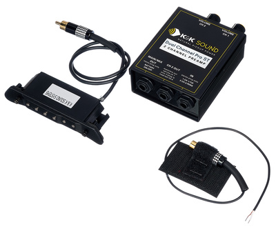 K&K Double Helix Upgrade System, in addition to the Pure Pickup, comes with one K&K Double Helix soundhole pickup, hum-cancelling dual-coil pickup for steel-string acoustic guitars, it features a phase switch and a unique tone switch that allows players to easily change from a bright GLOSS setting to a more substantial STEAM setting, K&K Dual Channel Pro Preamp ST preamp, compatible with both piezo and magnetic pickups, one stereo input, two outputs, a main/mix out and an individual channel output, internal 3-band EQ for both channels, 2 x volume control, frequency range 10 - 30,000 Hz, input Impedance: 1 Mega Ohms, output Impedance: 3 K Ohms, average current: 3.5 mA.