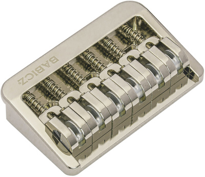 Babicz FCH Fixed 6 Hardtail N, Bridge for Electric Guitar, 6-String version, Suitable for right- and left-handed instruments, Suitable for F-Style Vintage and American STD guitars, Patented eCAM saddle technology, Larger contact area improves sustain, tone and response, Side Saddle Lock function ensures backlash-free saddle locking, 3-Hole mounting, String spacing (B to e): 52.5 mm, Lightweight design made of milled aluminium, Finish: Nickel, Incl. screws, instructions and Allen key