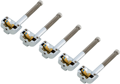 Hipshot 5 KickAss Saddle Set - Chrome, Saddle Set for 5-String Electric Bass, Suitable KickAss, Omega, BadAss II und BadAss V bridges, Adjustable string spacing from narrow 17.5 mm to wide 20 mm and everything in between thanks to fully adjustable, pre-notched brass inserts, Tone can be fine-tuned using interchangeable brass or stainless steel saddle inserts (not included), Material: Solid cast zinc, Colour: Chrome, Set with 5 pieces