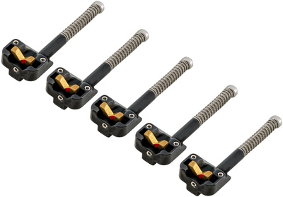 Hipshot 5 KickAss Saddle Set - Black, Saddle Set for 5-String Electric Bass, Suitable KickAss, Omega, BadAss II und BadAss V bridges, Adjustable string spacing from narrow 17.5 mm to wide 20 mm and everything in between thanks to fully adjustable, pre-notched brass inserts, Tone can be fine-tuned using interchangeable brass or stainless steel saddle inserts (not included), Material: Solid cast zinc, Colour: Black, Set with 5 pieces