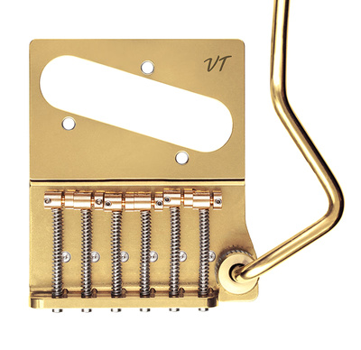 VegaTrem VT2ND Teletrem Classic Gold, Vibrato System for T-style Guitars, Suitable for guitars with standard bridge dimensions (71mm between the string holes to the top screw of the bridge pickup), Simple, precise and tuning-stable vibrato system, No new holes/milling required for mounting, Saddle height and intonation adjustable, String spacing: 10.8 mm (54 mm from E to E), Dimensions: (L x W x H) 99.3 x 85 x 17 mm (without tremolo bar), Made of stainless steel, Brass saddles, Without VT logo on the vibrato arm, Finish: Gold, Includes screws and 1.5 mm and 2 mm Allen key