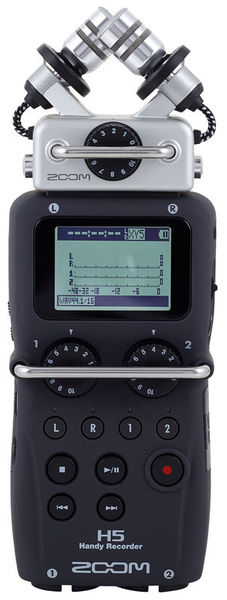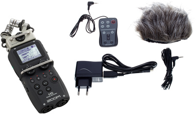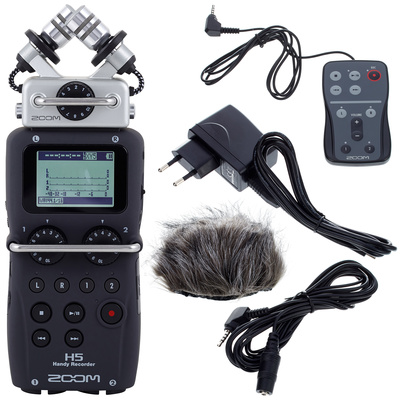 " Zoom H5 APH-5 Bundle@+*Bundle offer comprising*, Zoom H5@+*Portable Audio Recorder*, Uses a system of interchangeable microphone capsules, Includes detachable X/Y capsule (XYH-5), Compatible with all Zoom input capsules, Records up to 24-bit / 96 kHz, Recording format: WAV (BWF compatible) and MP3, 4-track simultaneous recording, Large backlit LCD display, Records directly to SD and SDHC cards up to 32 GB, 2 mic/line inputs with XLR/TRS combo connectors, each with selectable phantom power and -20 dB pad, Gain control knob on each input, with protective 'roll-bar' that prevents accidental movement during handling, Plug-in power (2.5 V), Built-in effects, including high-pass filter, compressor and limiter, Chromatic tuner and metronome, Auto-record, pre-record and backup-record functions, M/S decoding, Multitrack to stereo internal mixdown, Normalize, divide, and trim editing, A/B loop playback, Integrated loudspeaker, Variable playback speed and pitch (without tempo change), Multichannel and stereo USB audio interface for PC, Mac and iPad (requires optional camera connection kit), 1/4"" Attachment screw-hole on the back side, Powered by 2 Conventional AA alkaline batteries or NiMH rechargeable battery packs, Operating time (with alkaline batteries): approx. 15 h, Dimensions of H5: 67 x 135 x 42 mm, Dimensions of XYH-5 capsule: 66 x 82 x 41 mm, Weight H5: 176 g, Weight XYH-5: 94 g@+*Includes:*@+@+, XYH-5 X/Y microphone capsules, USB Cable, Foam windscreen, Case, Zoom APH-5@+*Accessories Set for Zoom H-5*Including:*@+@+, Power adapter AD17, Windjammer WSU-1, Wired remote RCH-5, Thomann LR6 AA 4pc@+*4-Pack AA Batteries 1.5 V (Type LR6)*, Alkaline mignon batteries (type AA), Colour: Black, Package quantity: 4 Pieces@+*Note on disposal:* In line with the Battery Directive (Batteriegesetz; BattG), you as the consumer are obligated to return all batteries and rechargeable batteries. Disposal via normal household waste is not permitted! Batteries containing pollutants can be identified by the symbol of a crossed-out wheeled bin and the chemical symbol (Cd = cadmium; Hg = mercury; Pb = lead) of the metal essential for classification.@+@+Used batteries and rechargeable batteries can be returned free of charge to our shop, to other outlets where batteries are sold or to public waste management authorities.@+"