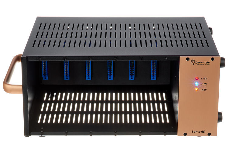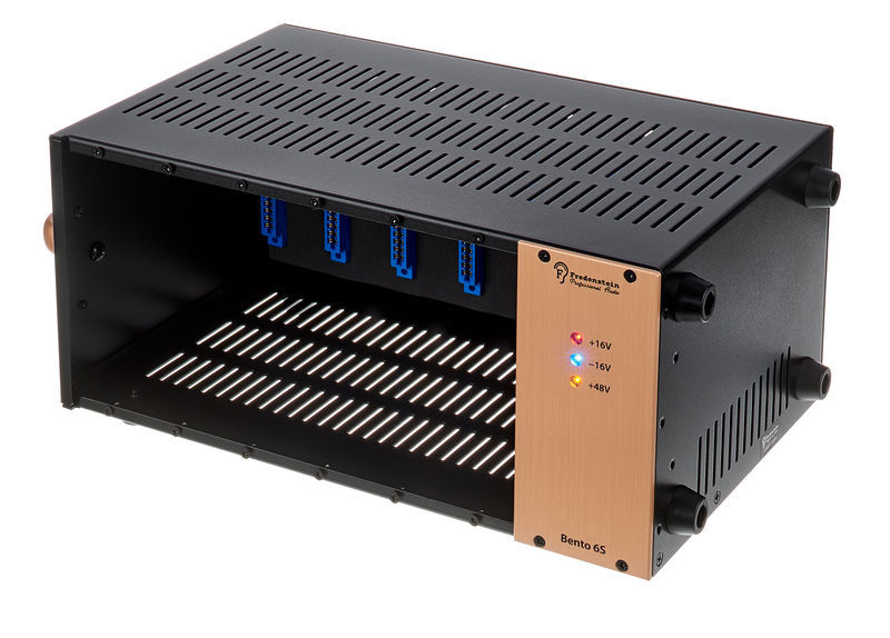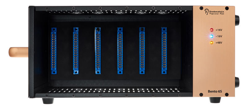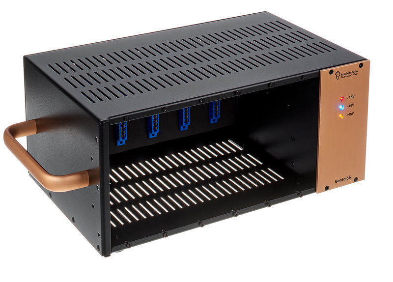 " Fredenstein Bento 6S, 6-Slot Rack for Modules of API 500 Systems, Internal power supply +/- 16 V/ +48 V, Reduced cabling, so that the audio routing may be switched from card to card on the rear panel, Intelligent power distribution, Energy efficient, Low-noise integrated power supply, Matching 19"" rack kit available under Article Nr #341739# (not included)"