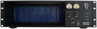 " Fredenstein Bento 8 Pro Pure Analog, 8-Slot Rack for API 500 System Modules, With analogue power supply +/- 16 Volt / +48 Volt, 500 mA per slot, Reduced cabling effort, as the audio routing can be switched from card to card on the rear panel, Compressor link and ground lift switch, Intelligent voltage distribution, Energy efficient, Integrated monitoring section with headphone amplifier as well as 2x VU meters to control the individual channels, Design: 19"" / 3U"