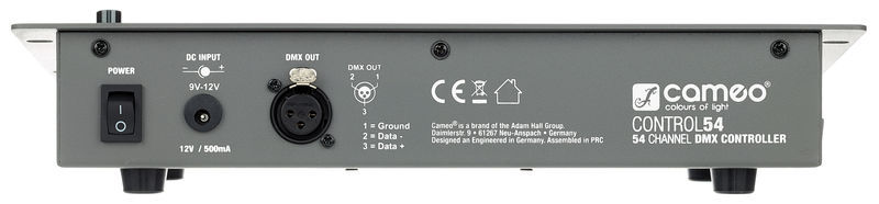 Cameo Control 54, 54-Channel DMX Controller, For a maximum of 9 spotlights or spotlight groups, Suitable for all RGB, RGBW, RGBWA and RGBWA+UV spotlights, 6 Smooth faders to mix red, green, blue, white, amber and UV, 9 Colour presets with quick-access buttons, Quick selection of automatic or manual mode, Blackout, Colour jump, Colour fade, Strobe and sound control with adjustable microphone sensitivity, DMX output: XLR three pole female, Operating voltage: 9 - 12 V DC, Dimensions: 316 x 140 x 63 mm, Weight: 1.5 kg, With mains adapter and 9 V block battery for optional battery operation