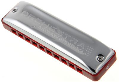 C.A. Seydel Söhne Orchestra S G, Orchestra Harmonica, Tuning: G, Compact design with 10 chamber openings in solo tuning, Extended range in the lower register (orchestra tuning), 20 Stainless steel reeds, Rivets, sound cover and screw connections made of stainless steel, Reed plates made of corrosion-resistant nickel silver, Comb body made of lip-friendly ABS plastic, With internal reed plates, Colour: Stainless steel / carmine red transparent, Includes leather case