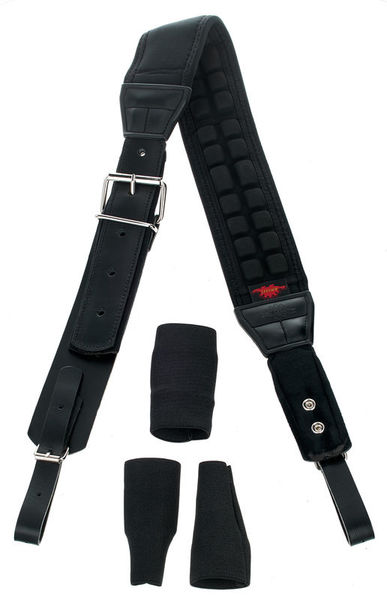 Air Cell Tuba Strap, Carrying strap@+The padded shoulder or neck straps consists of many small, air-filled cells. With those, the pressure on shoulder or neck is absorbed and the weight of the instrument is spread over a large area. In addition to the optimal comfort the air padding suggests a weight reduction of the instrument.@+@+, Suitable for Tuba, Elastic neoprene with very soft, large-area air cell padding, Robust fabrication, Both ends with leather loops, Additional protective covers for buckles, Width of the air cell pad: 7cm, Variable length 103-123 cm, Colour: Black
