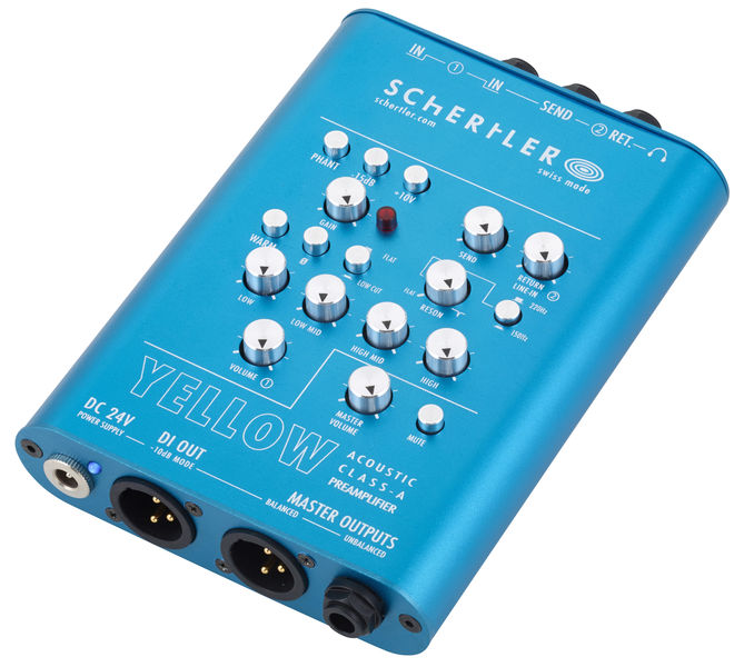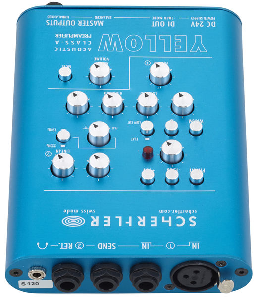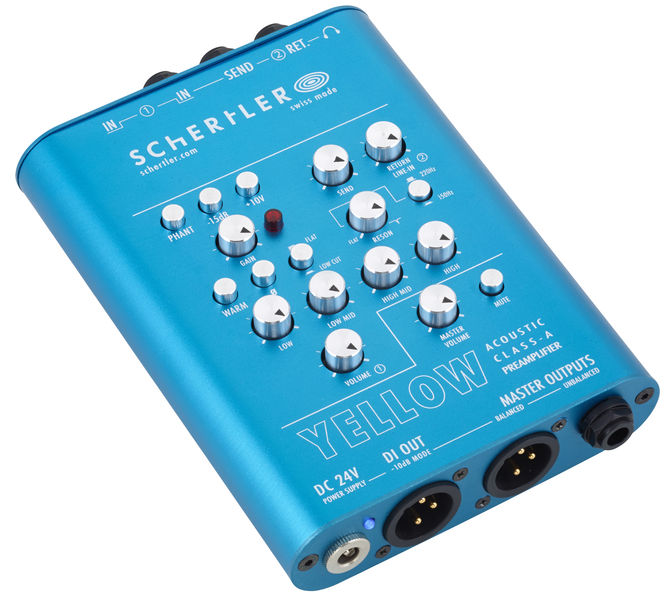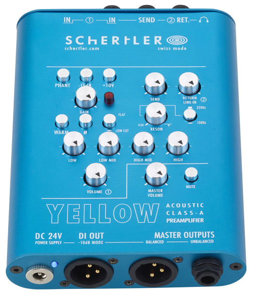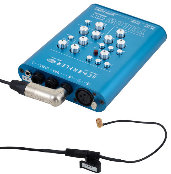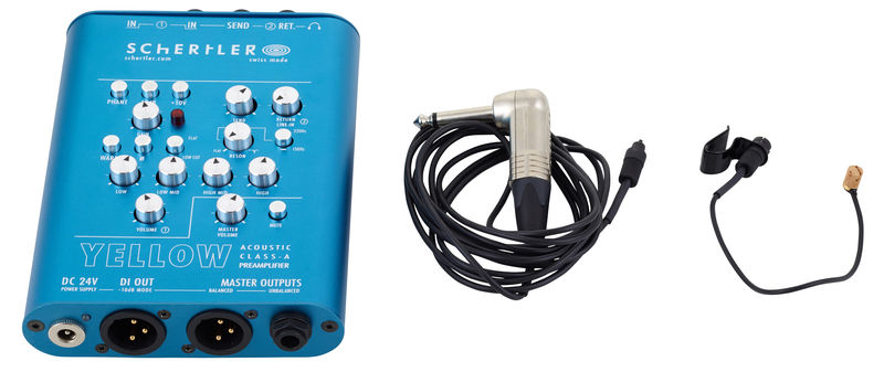 Schertler Stat-V-Pro, Pickup Set for Violin and Viola, Consists of the STAT-V violin & viola pickup and the Yellow Single preamplifier, Electrostatic violin pickup, High dynamic range and high linearity, Simple and quick mounting, Greatly reduces feedback sensitivity due to the bridge pickup, The Schertler Yellow Single preamplifier offers a modern design in a lightweight aluminium housing, 2 Input channels for all types of microphones and pickups, 4 Outputs with multiple connection options, Headphone output, Loop for effects with send & return, 4-Band EQ with extra filters for maximum tone control and flexibility, High-end Class A electronics for the best possible sound performance, Made in Switzerland