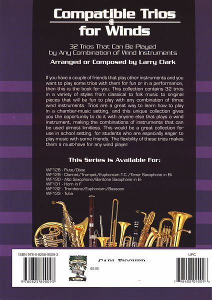 Carl Fischer Compatible Trios for Winds: 21 pieces arranged for flexible ensemble, edition for 1 to 3 trumpets, clarinets, euphoniums (violin clef) or tenor saxophones, arranged by Larry Clark. The books in this series can be combined with each other. ISBN 9780825890093, WF129, 23 x 30.5 cm, 48 pages