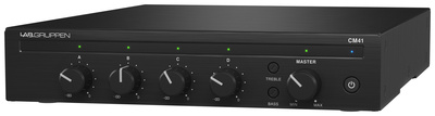 LAB Gruppen CM41, 4-Channel Installation Mixer, 4 Microphone/line inputs with volume controls, Master volume control, Bass/treble control, GPI remote volume control via RJ-45 Ethernet, Rack-mountable 1U housing with half rack width, 3 Euroblock 3-pin inputs, 1 Euroblock 5-pin input, 3 RCA inputs, 1 Euroblock 3-pin output, Dimensions (W x H x D): 218 x 44 x 299 mm, Weight: 2.1 kg, Colour: Black, Rackmounts for double or single mounting included