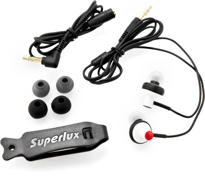 Superlux HD 381 F "Front row" In Ear HiFi headphones, flat frequency, dynamic with 13,5 mm drivers, Impedence 16 ohms, sensitivity 103 dB, frequency band 20 Hz to 20 kHz, 60 cm cable with 3,5 mm mini-jack, various ear pads, includes extension cable 60 cm long and cable grip, color: white