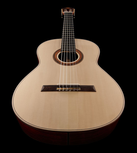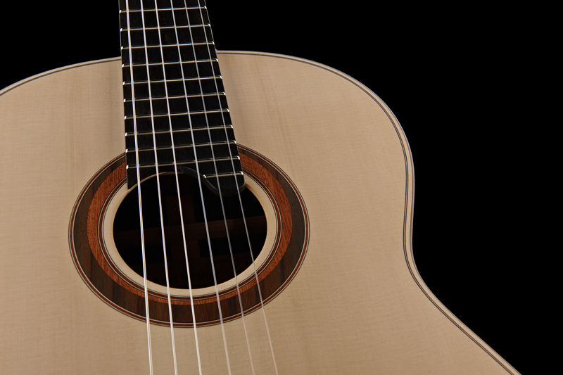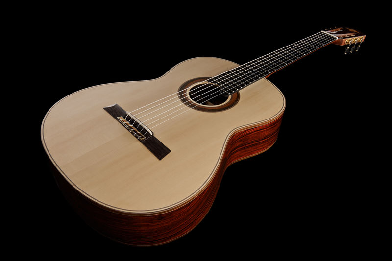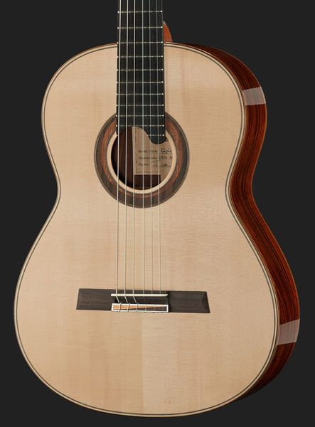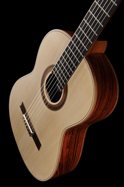 Höfner HM96 Gigue, Master Guitar, Solid spruce top (air-dried), Solid Cocobolo (Dalbergia Retusa) back and sides with natural resin finish, Mahogany neck oiled and waxed, Body binding, neck reinforcement, headstock veneer and bridge made of rosewood (Dalbergia latifolia), Ebony fretboard, Scale: 650 mm, Nut width: 52 mm, Thin surface finish, Colour: Natural, Made in Germany