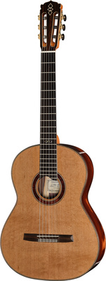 Hanika Custom 58 3PC, Classical Guitar, Top: Solid cedar, Back and sides: Solid 3-layer, high-quality wood, Soundboard bracing: 7-piece symmetrical arched, Top binding: Rosewood, White-black-white back binding, Headstock: Makassar, Crown shape: Hanika-Standard, Neck: Cedro, Fingerboard: Grenadilla, 3-diamond abalone fingerboard inlay on the octave fret and side markings on the 5th and 7th frets, Neck profile: C-1 mm, Side purfling: Rosewood, Scale length: 650 mm, 20 frets, Nut width: 52 mm, Bone nut, Rosette: Violet Rosewood, Bridge: Ziricote, Saddle: Bone, Machine heads: R2-SE, Colour: Natural, high-gloss HE, Includes black Hanika Hiscox case, Made in Germany