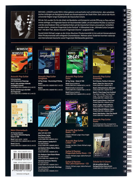 Edition Dux Acoustic Pop Guitar Songbook 2, Songbook for Acoustic Guitar, 30 Pop songs arranged for acoustic guitar, By Michael Langer, In standard notation and tablature, With lyrics and chords, With suggestions for strumming and picking accompaniment, Easy to intermediate level of difficulty, ISBN: 9783868491951, ISMN: 9790500171546, Publisher's no. D 874, Format: 23 x 30 cm, Spiral binding, 130 Pages, Includes download with demo recordings