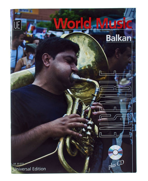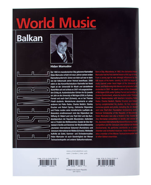 Universal Edition World Music Balkan Ensemble, Songbook for Ensemble in Variable Instrumentation, 7 Folk songs from the Balkan countries - arranged for ensemble in variable instrumentation, For 2 melody instruments (Bb-, Eb-, C), guitar, bass, piano and percussion, Arranged by Mamudov Hidan, Score, Single parts included as PDF on CD, Easy to medium difficulty, ISBN 9783702471040, ISMN 9790008084362, publisher's no. UE35572, Format: DIN A4, 44 Pages, Includes CD with demo and play-along recordings
