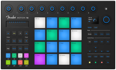Fender Motion 16; compact production and performance controller with deep Fender Studio Pro integration; 16 RGB polyphonic Fatar pads for drums, melodies and chords; 9 touch-sensitive illuminated encoders for real-time control; touch strip for modulation, pitch and effects; Smart Scale and Smart Chords with more than 30 chord progressions; colour display for instant visual feedback; Add button for virtual instruments, audio tracks and effects; timeline navigation and session control directly on the device; compatible with all popular DAWs; ideal for songwriting, beatmaking, finger drumming and sequencing; dimensions: 178 x 305 x 25 mm; weight: 0.95