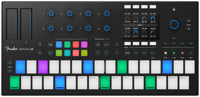 Fender Motion 32; compact production and performance controller with deep Fender Studio Pro integration; 32 RGB polyphonic Fatar pads for drums, melodies and chords; 8 touch-sensitive illuminated encoders for real-time control; two touch strips for modulation pitch and effects; Smart Scale and Smart Chords with more than 30 chord progressions; colour display for instant visual feedback; Add button for virtual instruments, audio tracks and effects; timeline navigation, transport editing and mixing directly on the device; compatible with all popular DAWs; ideal for songwriting, beatmaking, finger drumming, sequencing and live performance; dimensions: 178 x 381 x 25 mm; weight: 1.1 kg