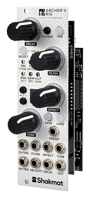 Shakmat Modular Archer´s Rig, Eurorack Module, Hi-Hat and percussion synthesiser and noise generator with hybrid sound generation, Digital sound source with 13 selectable algorithms (noise, sine, bell, metal, FM, 808, 909, grains and more) and external mode for processing external signals through the analogue signal path, Digital effects section with 9 selectable algorithms (Ring Modulation, FM, Comb Filter, Sample Rate Reducer and more), VCA (voltage controlled amplifier) with decay envelope, Analogue multimode filter with resonance and additional low-cut filter, Analogue gain and distortion stage, Controls for decay, filter, effect and tune - each with CV input, Trigger button and trigger inputs for open hi-hat and closed hi-hat, CV inputs for velocity and preset selection, Memory locations for 96 presets and randomiser function, Compatible with Select Bus protocol, Power requirement: 105 mA (+12V) / 45 mA (-12V), Width: 8 HP, Depth: 21 mm