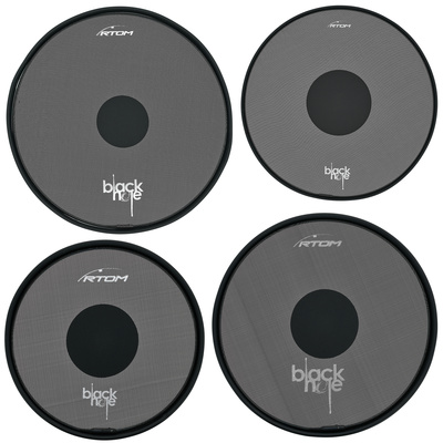 " RTOM Black Hole Pra.Pad Bundle Std.@+*Bundle offer comprising*, RTOM 22"" Black Hole Practice Pad V2@+*Practice Pad for Kick Drums*, Size: 22"", Reduces the volume of the drum by 80%, Keeps the basic sound of the drum, 3 Adhesive foam strips for fixing inside the kick drum hoop@+no removement of the drum head needed, single-point-tuning-system - tension of the mesh head can be adjusted with only one screw,, RTOM 16"" Black Hole Practice Pad@+*Practice Pad*, Size: 16 "", Reduces the intrinsic volume of the drums by up to 80%, Basic sound of the drum is retained, Is simply put on - no head removal needed, The desired tension of the mesh head can be adjusted with just one screw, RTOM 12"" Black Hole Practice Pad@+*Practice Pad*, Size: 12 "", Reduces the intrinsic volume of the drums by up to 80%, Basic sound of the drum is retained, Is simply put on - no head removal needed, Desired tension of the mesh head can be adjusted with just one screw, RTOM 10"" Black Hole Practice Pad@+*Practice Pad*, Size: 10 "", Reduces the intrinsic volume of the drums by up to 80%, Basic sound of the drum is retained, Is simply put on - no fur removal needed, Desired tension of the mesh head can be adjusted with just one screw"