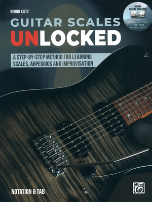 Alfred Music Publishing Guitar Scales Unlocked, Further Literature for Guitar, Instructional book for learning scales, By Bernd Kiltz, ISBN: 9783947998678, publisher's no. ALF 20237US, Format: 21 x 30 cm, 148 pages, Book is in English, Includes online audio with 2½ hours of video material and 100 MP3 play-alongs