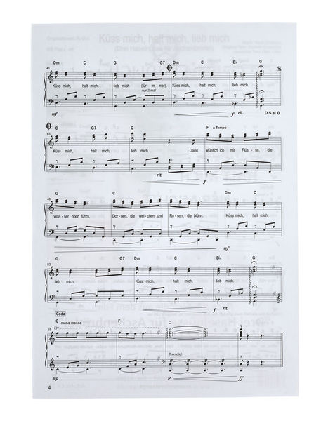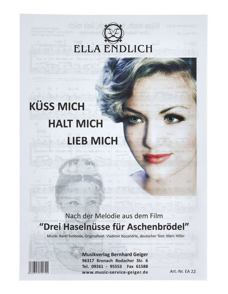 " Musikverlag Geiger Küss Mich Halt Mich Lieb Mich: Küss mich,halt mich,lieb mich, Single sheet music for voice and piano, By Ella Endlich, According to the melody from the motion picture ""Drei Haselnüsse for Aschenbrödel"", Music by Karel Svoboda, Original lyrics by Vladimir Kocandrle, German lyrics by Marc Hiller, With German lyrics and chords, Easy to intermediate level, Melody in piano part included, EA 22, EAN 4260307722722, 4 pages"