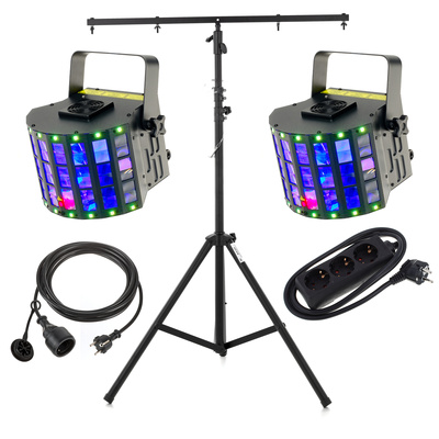 Varytec Razor Derby Bundle@+*Bundle offer comprising*, 2x Varytec Razor Derby@+*LED Derby with Built-In Effect Laser*, Compact derby effect creates red, green, blue and white beams, Creates a special effect with its 16 RGB effect/strobe LEDs, 30W COB LED illuminates the dance floor with 48 very sharp beams, DMX controllable, Automatic and Sound-to-Light modes, Suitable for use in master/slave configurations, With IR remote control for controlling basic functions (CR2025 button cell not included), The additional effect laser projects various red and green patterns onto the floor, Produces an even greater effect in combination with fog or haze, Light source: 30 W COB RGBW, 16 RGB LEDs, Laser class 2M: 100 mW red (650 nm), 30 mW green (532 nm), IP protection rating: IP20, Colour display with four buttons, Power input: IEC, DMX input and output: XLR 3-pin, Power supply: 100-240 V AC, 50/60 Hz, Power consumption: max. 80 W, Fan-cooled, Black metal housing, Dimensions without bracket (L x W x H): 185 x 205 x 155 mm, Dimensions with bracket (L x W x H): 230 x 205 x 215 mm, Weight: 1.94 kg, Millenium LST-310 Lighting Stand@+*Light Tripod with T-bar*, Completely made of metal, For up to 4 spotlights, Safety splint at the telescopic tube prevents from sliding, Height: 177 - 310 cm, Pivot of the t-bar traverse: à 28 mm, Length of t-bar traverse: à 120 cm, Transport length collapsed: 137 cm, Weight: 8 kg, Max. load: 18 kg, Colour: Black, Stairville Mains Extension MC 5m 1,5 mm²@+*Extension Cable*, 5.0 m, Safety connector with moulded plug and socket, Cable type: H05VV-F 3G 1.5 mm², Colour: Black, Stairville Power Split 3 Way Black@+*3-Way Power Strip*, Sockets at a 45° angle, Cable: H05VV-F 3x 1.5 mm², Rivetted plastic housing, Cable length: 1.5 m, Colour: Black