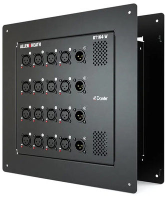 Allen & Heath DT164 W Dante, Dante I/O Expander, For permanent installation, wall or floor mounting, Dante Audio Expander: 96 kHz / 48 kHz, Compatible with dLive, Avantis, SQ and AHM-64, AES67 compatible, Dante Domain Manager ready, Plug-and-play, Redundancy and switched mode, Control and firmware updates via mixing console or DT Preamp Control software, Robust steel housing, Power supply 100â230 V AC or 12 V DC for redundancy, 16 mic/line XLR inputs with +48 V phantom power, Status LEDs, Gain and pad control, 4 balanced XLR line outputs, 2x EtherCon Dante ports for audio and control data, Daisy chaining and redundancy, Dimensions (W Ã H Ã D): 210 Ã 300 Ã 80 mm, Weight: 3.6 kg