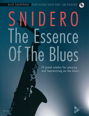 Advance Music Essence Of Blues A-Sax, Study Book for Alto Saxophone, 10 Blues Etudes for Alto Saxophone solo, By Jim Snidero, With chords, Easy to medium difficulty, ISBN 9783954810512, ISMN 9790206300370, publisher's no. ADV 14530, Format: DIN A4, 56 Pages, In German and English, Includes CD with demo and play-along recordings