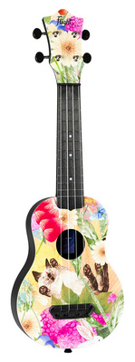 Flight UTS-42 Summer Cat Ultra Travel, Soprano Ukulele, Back, sides and top: reinforced polycarbonate plastic, Neck and fingerboard: reinforced polycarbonate plastic, Fingerboard inlays at 5th, 7th and 10th fret, Nut width: 37.3 mm, 12 Frets, Zero fret, Strap pin, Open machine heads, Factory strings: Flight Fluorocarbon Strings (art. #514939#), Colour: Summer Cat Print, Incl. gig bag