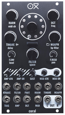 OXI Instruments Coral Black; Eurorack module; digital synthesizer with 8 voices shared by 8 parts;10 selectabe synth-engines: Virtual Analog, Waveshaping, FM, Wavetable, Multi Oscillator, String, HiHat Synth, Snare Synth, Kick Synth and Wav Player; 3 adjustable parameters for each synth-engine; for each voice additional noise generator, filter, VCA, 2 envelope generators, adjustable panorama and chorus effect; limiter and reverb for master bus; all parameters controllable via MIDI CC; 9 assignable CV inputs; MIDI input (3.5mm TRS, type A & B); stereo output (x2 3.5mm jack); microSD card slot for importing presets, wavetables and audio samples; power consumption: 110mA (+12V) / 10mA (-12V); width: 14 HP; depth: 30 mm