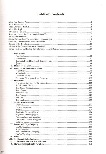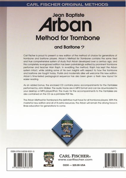 Carl Fischer Arban Method for Trombone, Method for Trombone, For slide, valve, and baritone trombone (bass clef), By Jean Baptiste Arban, Published by Charles Randall, Simone Mantia, and Alan Raph, ISBN: 9780825893315, publisher's no. CF 12043, Format: 23 x 30.5 cm, 360 Pages, In English, Includes download for demo versions and piano accompaniments