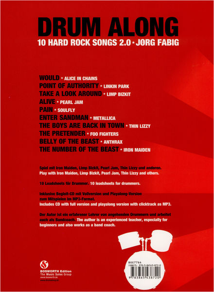 Bosworth Drum Along 10 Hard Rock 2.0, Songbook for Drums, 10 Hard rock songs, Arranged for drums, By Jörg Fabig, Level of difficulty: Easy, ISBN: 9783865438720, Publisher's No.: BOE 7764, Format: DIN A4, Pages: 48, Includes a CD with demo- and play-along versions
