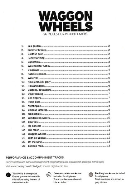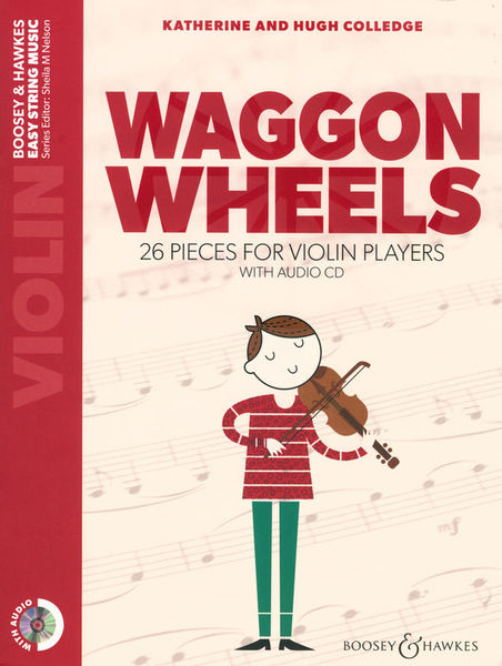 Boosey & Hawkes Waggon Wheels, Songbook for Violin, 26 Pieces for violin, By Katherine and Hugh Colledge - arranged by Sheila Nelson, 2018 Revised edition, Easy level of difficulty, ISBN: 9781784543587, ISMN: 9790060134227, Publisher's no. BH 13422, Format: DIN A4, 16 Pages, Includes download with demo and play-along versions