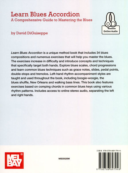 Mel Bay Learn Blues Accordion, Study Book for Accordion, For playing the blues on the accordion, By David DiGiuseppe, ISBN 9780786697946, MB30520M, DIN A4, 96 Pages, In English language, Includes download for demo recordings