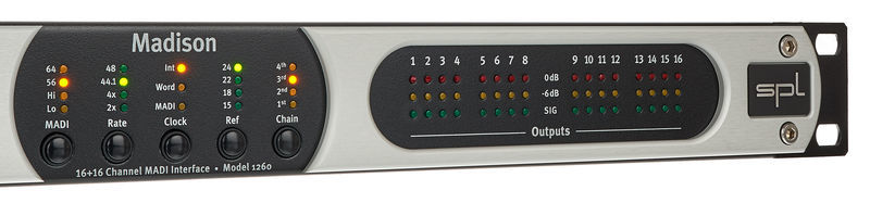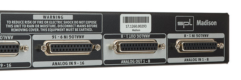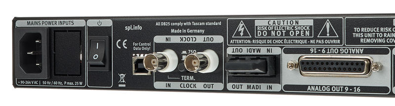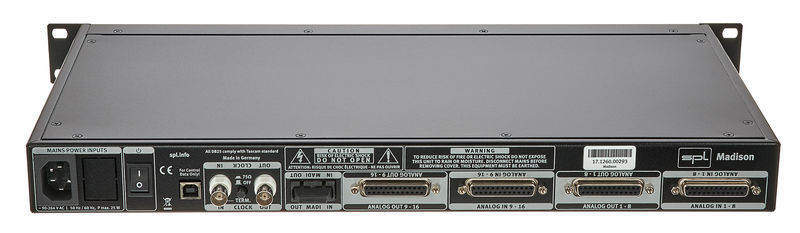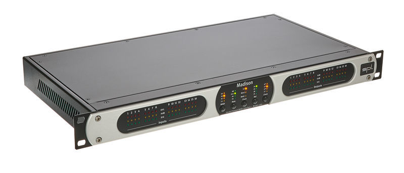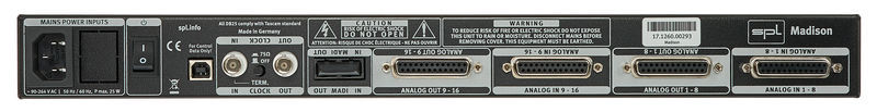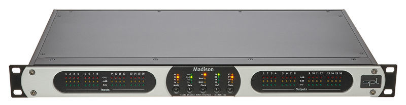 " SPL Madison, 16-Channel MADI AD/DA Converter, 44.1 to 192 kHz, 36V analog technology, +24 dBu output level, MADI chaining, Four selectable reference levels: 15/18/22/24, Fanless and sound-free low-energy design, 4x Sub-D DB25 connectors (TASCAM industry standard), 2 Power connections for redundant power supply, USB, Word clock, 19"" 1U"