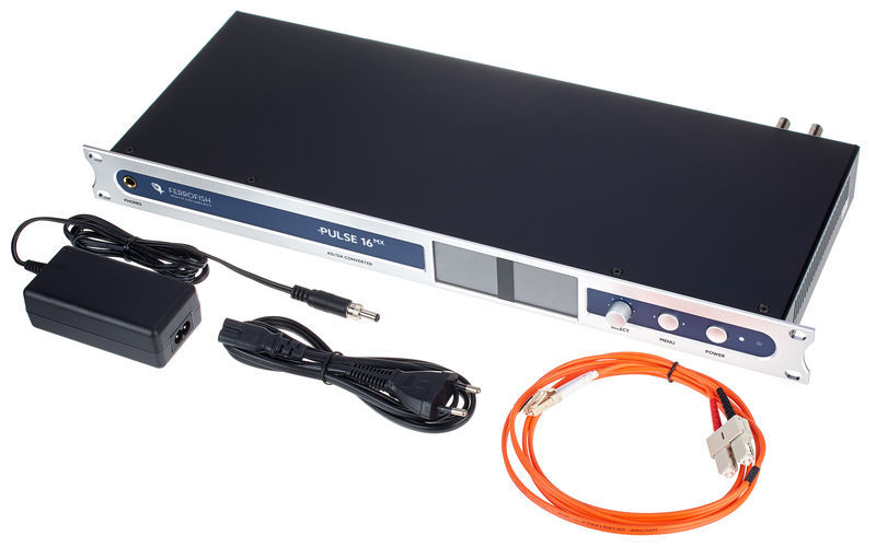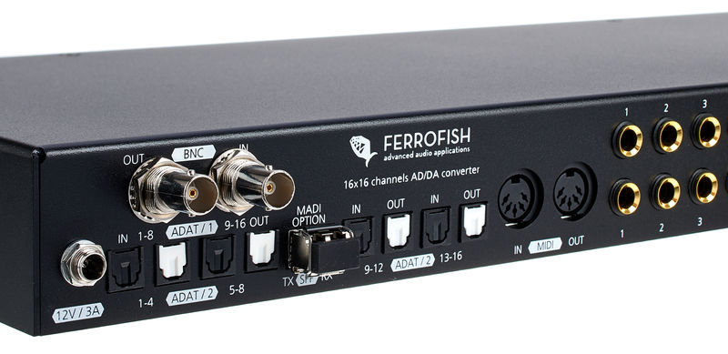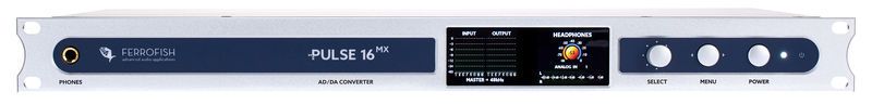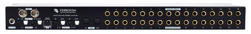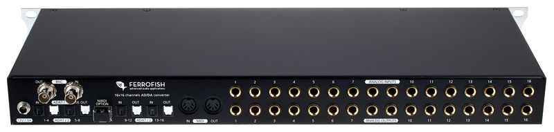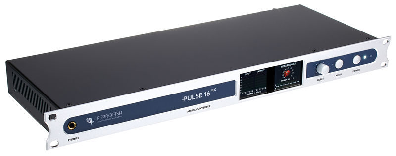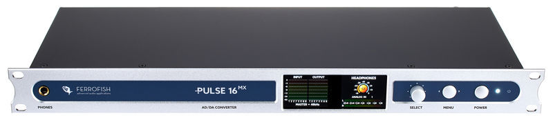 " Ferrofish Pulse16 MX, AD / DA converter with ADAT and MADI, 24bit / 96kHz converter, 2 TFT displays for levels and settings for a complete overview of all levels and settings on the device, Jacks for quick and easy cabling, All 32 analog channels can be used at 96 kHz, Input and output volume of all analog channels switchable in 1dB steps (-8 dBu to +20 dBu), Circuit for active jitter reduction, Fanless, 16 Analog inputs 6.3 mm jack balanced, 16 Analog outputs 6.3 mm jack balanced, 4 ADAT inputs and outputs, 1 MIDI input and output, 1 Word clock input and output, MADI, Headphone output: 6.3 mm jack, Power supply connection: A / B, 12 V DC / 3A, Dimensions: 19"", 1 U"