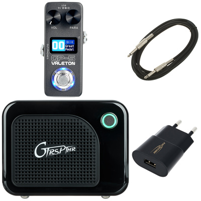 " Valeton GP-5 + Cab Bundle@+*Bundle offer comprising*, Valeton GP-5@+*Multi-Effect Pedal for Electric Guitar*, Ultra compact multi-effect processor SnapTone and IR loader, HD modelling technology on the new platform that delivers more organic tones, 100 patch slots, Includes 50 factory patches, Over 100 different effects, Simultaneous use of up to 9 effects / modules possible, 20 IR memory locations, Integrates the latest SnapTone technology from Valeton, which enables the conversion and import of NAM (Neural Amp Modeler) files, Customisable footswitch allows versatile patch switching methods or control of switching on/off of single or multiple effects, Together with the LC color display, it adapts seamlessly to a wide range of stage environments, Built-in BT wireless function for seamless wireless editing and management of your sounds via a mobile app, Controls: Volume, Para, Display: Colour LCD, Input: 1 x 6.3 mm jack, Stereo output: 1x 6.3 mm stereo jack / headphones, USB 2.0 type-C, Bluetooth 5.0, Power supply connection: Barrel connector 5.5 x 2.1 mm, centre negative, Current consumption: DC 9 V = 100 mA / USB = 190 mA, Power supply with a 9 V DC mains adapter (not included), Dimensions (W x D x H): 42 x 94 x 52 mm, Weight: 237 g@+*Note:* Battery operation is not possible. USB cable not included., Mooer GTRS PTNR Bluetooth Amp BK@+*Mini Combo Amplifier For Guitars*, Power: 5 watts RMS, Equipped with: Custom 2.2"" speaker 4 Ohm, Passive, vibrating membrane specially tuned for bass reproduction, Up to 7 hours battery life per charge, Integrated, rechargeable lithium-ion battery: 2,000 mAh, Combined volume control and on/off switch with status LED, Instrument input: 6.3 mm mono jack, USB Type-C connection, Dimensions (W x H x D): 104 x 130 x 75.5 mm, Weight: approx. 540 g, Colour: Black@+*Note* Register your product at www.w-distribution.de/Warranty and extend the warranty to 4 years.@+@+, Ansmann HC105 B@+*USB Charger*, 1x USB-A port, Input voltage: 100 - 240V AC, Max. input current: 0.3 A, Output voltage: 5V DC, Max. output current: 1000 mA, Max. output power 5 W, Colour: Black, the sssnake IPP1030@+*Instrument Cable*, Both sides: 6.3 mm mono jack, 0.22 mm² / AWG 24, Outer diameter: 6.0 mm, Length: 3 m, Colour: Black"