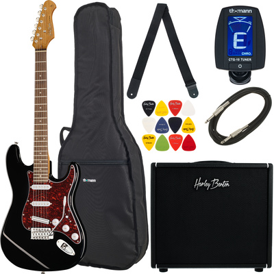 " Harley Benton ST-62BK Hot DNAFX AmP20 Set@+*Bundle offer comprising*, Harley Benton ST-62BK Hot Rod@+*Electric Guitar*, Body: Basswood, Bolt-on neck: vintage caramelised Canadian maple, Fingerboard: Laurel, Dot fingerboard inlays, Neck profile: C, Fingerboard radius: 305 mm (12""), Scale: 648 mm (25.50""), Nut width: 42 mm (1.65""), 22 Frets, Pickups: 2 Roswell STA Alnico 5 single coils (neck/middle) and 1 Roswell SHR Hot Blade ceramic humbucker (bridge), 1 Volume control with push/pull function for coil split, 2 Tone controls, 5-Way switch, Tortoise pickguard, Synchronised tremolo, Double action truss rod, Kluson-style machine heads, Deluxe chrome hardware, Factory strings: .010 - .046, Colour: Black, high-gloss, Harley Benton DNAFX AmP20@+*Modelling Combo for Electric Guitar*, 8 classic and modern guitar amp models: Clean, Country, Blues, Rock, Lead, Brown, Ultra and Metal, 6 programmable user preset modes, Class D power amplifier, Power: 20 W RMS / 50 W Peak, Equipped with: 1x 8"" full-range custom loudspeaker, DSP modulation effects with adjustable parameters: flanger, phaser, tremolo and chorus, DSP delay/reverb effects with adjustable parameters: spring, delay, Del+Rev and reverb, TAP tempo for delay effects, Controls: Drive and Master volume, 3-Band EQ with Bass, Mid and Treble controls, Digital chromatic guitar tuner with multi-coloured LED display, Bluetooth audio receiver for playing backing tracks from an external source, Instrument input: 6.3 mm jack, Stereo headphone out: 3.5 mm TRS mini jack, Line input: 3.5 mm TR mini jack, Foot switch input for switching between user presets (compatible footswitch: Art.#606262# - not included), Global voltage input: 100 - 240 V AC, 50/60 Hz, Dimensions (W x H x D): 333 x 346 x 202 mm, Weight: 6 kg, Colour: Black, Thomann E-Guitar Gigbag Eco@+*Gig Bag For Electric Guitar*, Standard edition, Internal dimensions: Approx (L x W x D): 105 x 35 x 8 cm, Patch pocket for accessories, Thomann CTG-10 Clip Tuner@+*Clip Tuner for Guitar and Bass*, Chromatic, Tuning via vibration sensor, Large backlit display, Two-tone display for showing the correct tuning, Rotates 360°, Includes battery (CR2032), Thomann Nylonstrap@+*Guitar Nylon Strap*, Adjustable length of about 80 to 139 cm, Width: 5 cm, Reinforced leather ends, Colour: Black, the sssnake IPP1030@+*Instrument Cable*, Both sides: 6.3 mm mono jack, 0.22 mm² / AWG 24, Outer diameter: 6.0 mm, Length: 3 m, Colour: Black, Harley Benton Nylon Player Pick Set Mixed@+*Guitar Pick Set*, 12 Picks of various thicknesses, Material: Nylon, Thickness: 2x each of 0.58 mm, 0.71 mm, 0.81 mm, 0.96 mm, 1.2 mm, 1.5 mm"