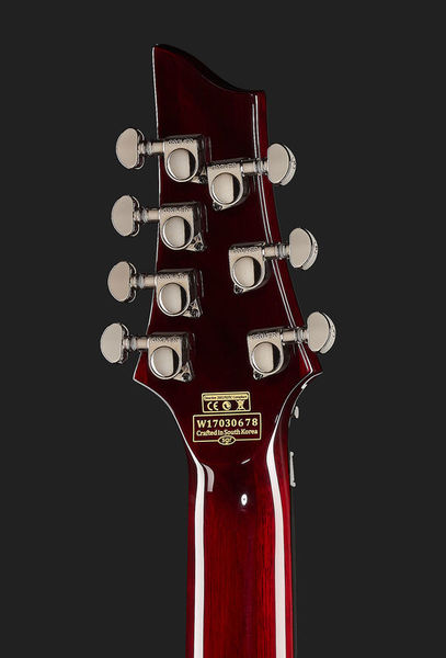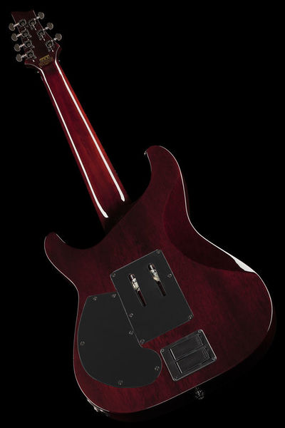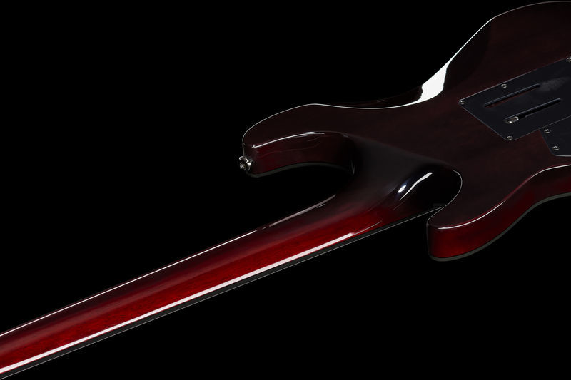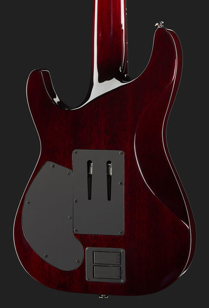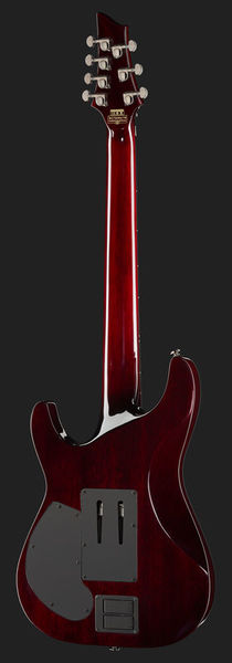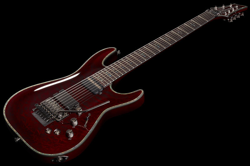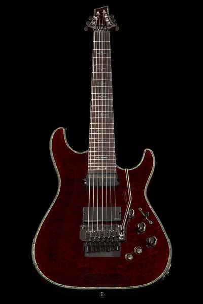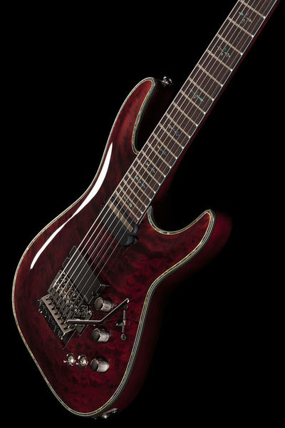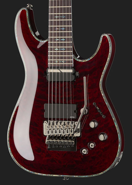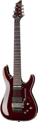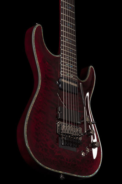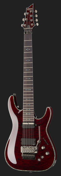 Schecter Hellraiser C-7 FR S BC, Electric Guitar, Mahogany body, Maple top (quilted maple), 3-Piece mahogany neck, Thin C neck profile, Rosewood fretboard (Dalbergia Latifolia), Fretboard radius: 406 mm, 24 XJ Frets, 673 mm scale length, 47.6 mm nut width, EMG 81-7 Humbucker (bridge), Sustainiac Pickup (neck), 1 x Volume control, 1 x Tone control, 3-Way toggle switch, 2-Way Sustainiac Switch (On / Off), 3-Way Sustainiac Mode Switch (Fundamental / Mix / Harmonic), Grover machine heads, Floyd Rose Tremolo, Black chrome hardware, Strings: Ernie Ball Regular Slinky 7 # 2621 (.010-.056), Finish: Black Cherry