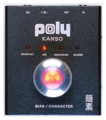 Poly Effects Kanso Boost, Effect Pedal for Electric Guitar, A collaborative development by Josh Smith and Poly Effects, Easy operation via a single large function knob, The Fknob is a foot switch, LEDs and rotary control in a single mechanism, Switch between 4 different sounding diodes and adjust their bias and character (level), Each diode is also a preset and remembers where bias and character were last set, Controls: Giant Fknob, LED: Giant Fknob, Footswitch: Effect bypass, Input: 6.3 mm jack, Output: 6.3 mm jack, MIDI In & Thru: 2 x 3.5 mm stereo jack, Power supply connector: Barrel connector 5.5 x 2.1 mm, centre negative@+Power supply via 9 V DC power supply unit (not included, suitable power supply unit: Art.#409939#), Current consumption: 100 mA, Dimensions (W x D x H): 75 x 85 x 58 mm, Handmade in Australia@+*Note:* Battery operation not supported