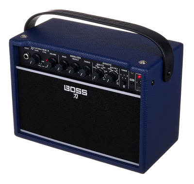 " Boss Katana Mini X Blue LTD, Modeling Combo Amplifier for Electric Guitar, Limited edition in blue, Channels: 1, Power: 10 watts, Equipped with 1 x 5"" speaker, Three selectable amp sounds: Clean, Crunch and Brown (plus variations), High-quality Boss effects: Chorus, Phaser, Tremolo, Touch Wah, Defretter, Synth, Octave, Reverb, Spring and Delay, Controls: Gain, Volume, Bass, Middle, Treble, Mod/FX, Reverb/Delay, Switch: Power, Amp Type Switch, Tuner/Bluetooth, USB-C battery for long-lasting performance and convenience (cable included), Up to ten hours playing time, Wireless audio transmission via Bluetooth, Built-in tuner, Stereo headphone socket with speaker voicing for quiet practice and direct recording, Input: 6.3 mm jack, Phones/Rec output: 3.5 mm stereo mini jack, 5V DC IN (USB-C), Resonant wooden housing with imitation artificial cover, Dimensions (W x D x H): 287 x 145 x 200 mm, Weight: 2.7 kg, Colour: Blue, Includes USB-C to USB-A cable"