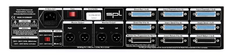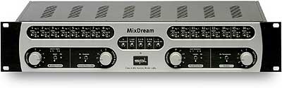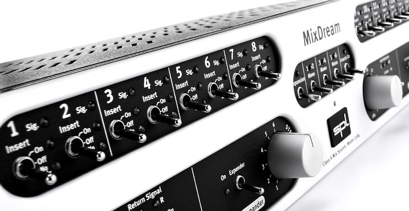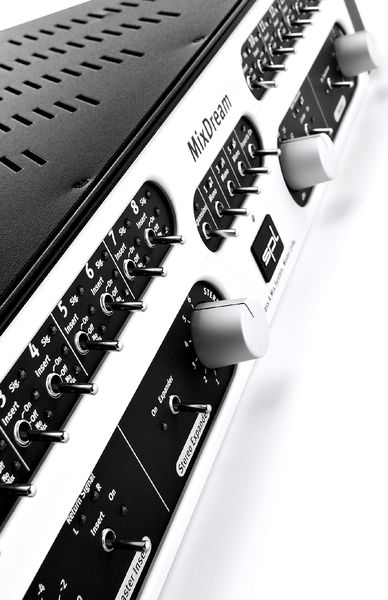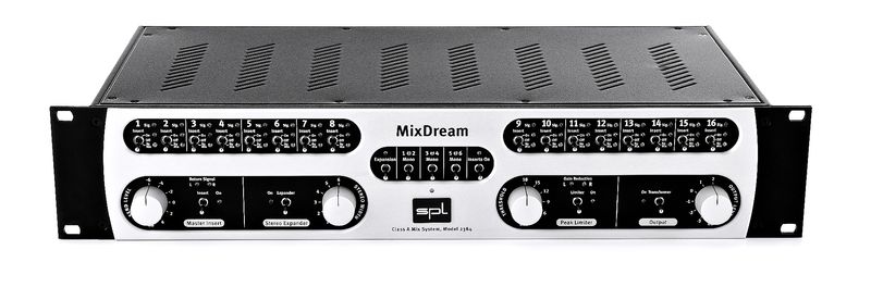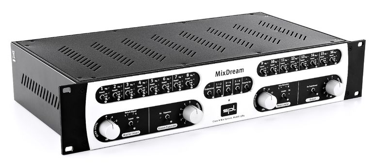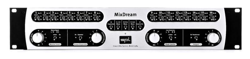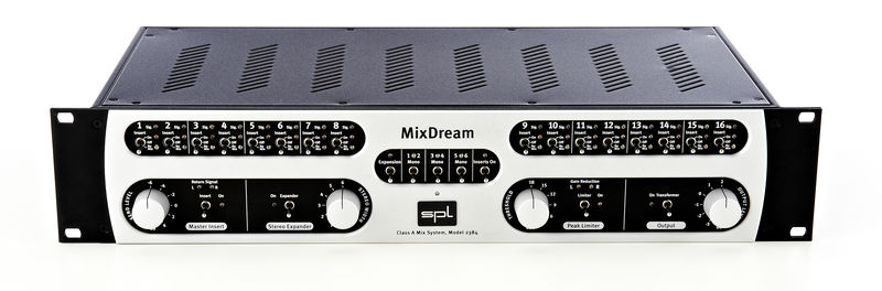 " SPL MixDream, 60V Analog AccumulatorThe MixDream allows both the central integration of analogue equipment into digital production environments as well as the stereo summation, i.e. the mixing together of the audio tracks on an analogue level. @+@+Conceptually, the reduction to high-quality analog summation, without the use of panorama controllers and faders, offers the great advantage of being able to maintain the entire computer automation. A MixDream can add 16 audio tracks to a stereo signal. If more than 16 tracks are to be summed, as many MixDreams can be used together.@+@+ The MixDream is based on discrete Class-A technology at 60V (/ -30V). Newly developed circuits based on state-of-the-art analog components ensure tremendously high rise rates, a low noise level of -97 dBu (A-rated, 16 channels open) and a high dynamic range of over 125 dB. Thus the MixDream can easily reach the technical level of the best consoles.@+@+, High-quality analogue summation to only 2U, No mixing console required, High-quality design with Class-A / 60V stages for the analog, active summation in the quality of the best analogue consoles, 16 symmetrical insert paths for optimal integration of analog effects into the DAW, Reduction of the A / D conversion (14 A / D conversions less with fully loaded inserts), summation of all analog tracks before the A / D conversion, Channel settings and automation (level, panorama, etc.) are still made in the DAW - the digital comfort remains fully preserved, Lower processor utilization of the DAW, Easy re-sampling of individual tracks, latency-free listening, Surroundable (from 3 MixDream units), Channel number can be expanded as required by additional units, Analogue peak limiter for powerful loudness gain, Sensitive and transparent stereo control, Master inserts and switchable output transformers, Optimized signal paths, all switching functions via relays, Separate differential amplifier for each input, Discretely built, low-noise power supply, Frequency range: <1Hz-220kHz (/ - 3dB), THD N: -104 dB (20Hz-22kHz, input level 10dBu, all channels active), Signal-to-noise ratio: -97 dBu (20Hz-22kHz, A-weighted, all channels active), Max. Input level: 28 dBu (@ 1kHz), Max. Output level: 28 dBu (@ 1kHz / THD N -95dB), Dynamic capture: 125 dB (20Hz-22kHz, A-weighted, all channels active), L / R: -97 dB @ 1 kHz, Common mode rejection: <70dB (@ 1kHz, input level 10dBu), Input Impedance: 10 kOhm (for Input 1-16, Expansion, Insert Return), Output Impedance: 82 Ohm (for master / monitor output without transformer, ins. Send), Output impedance: 65 Ohm (for master / monitor output with transformer), Power consumption: 75 W, 19 ""rack format with 2U"