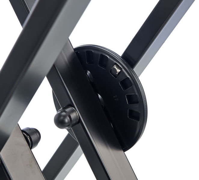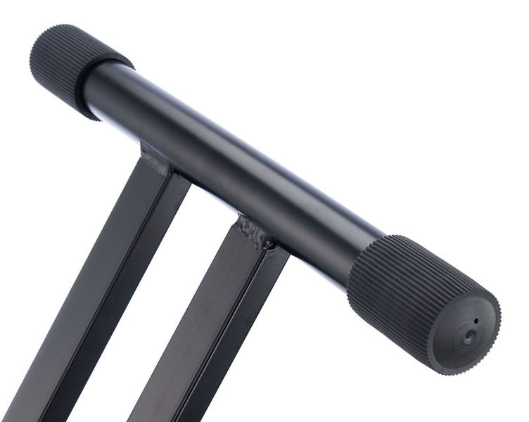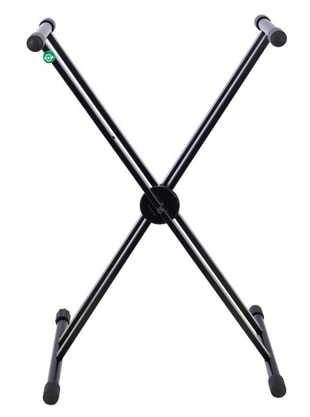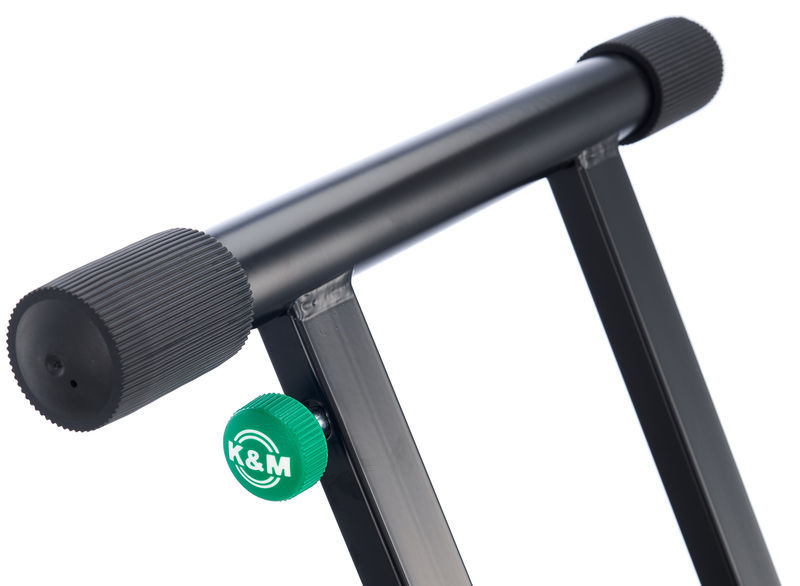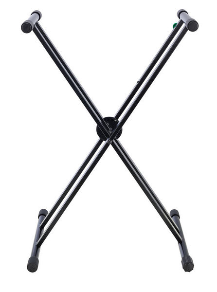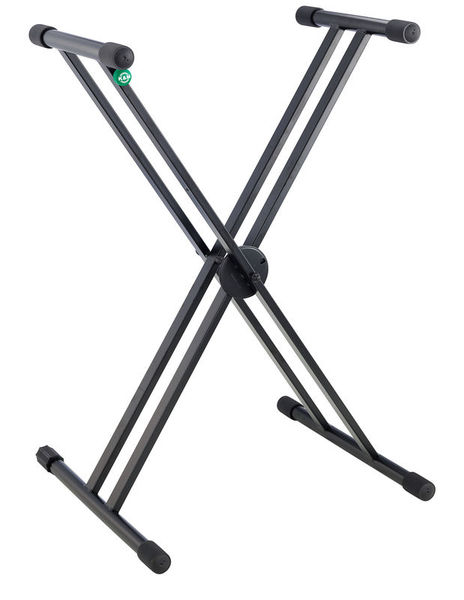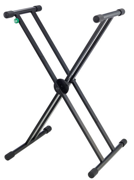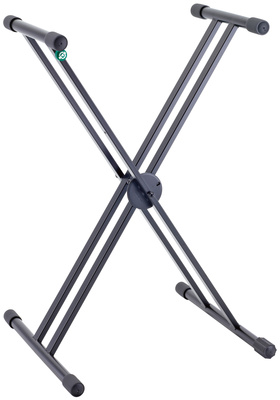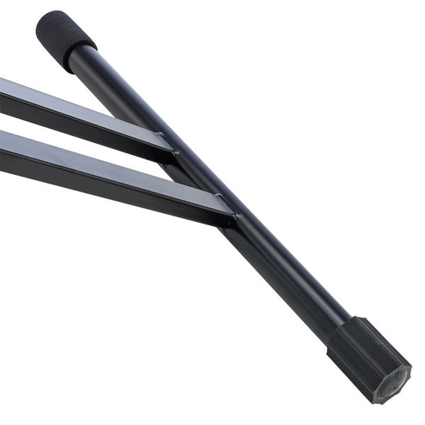 K&M 18995 keyboard stand - Extendable X-style double square keyboard stand with patented quick-release push button height-adjustment mechanism, height from 480 to 1,000 mm, suppoert width from 230 to 895 mm, support depth 350 mm, adjustable end cap to stabilize the stand on uneven surfaces, non-marring slip-proof pads, material steel, max. load capacity 40 kg, weight 6 kg, optional stacker 18941 #135978 available; suitable bag: Art. 501567, 501562 (not included)
