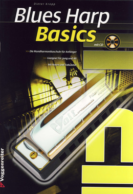 Voggenreiter Blues Harp Basics, Method for Harmonica, By Dieter Kropp, In standard notation and tablature, ISBN 9783802406843, publisher's no. VOGG 684, Format: 21 x 30 cm, 64 Pages, In German, Includes CD with demo recordings
