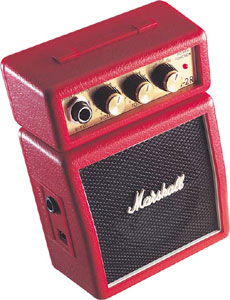 Marshall MS-2R, Mini-Stack Amplifier@+Although this tiny Marshall looks like a toy, it is shining in terms of sound. Clean and distorted, it sounds pretty crazy, it should come as no surprise that many use it simply for a fun practice (also usable with headphones it should be noted), but that even blues harp players have been spotted using this little guy. Great fun for less money!@+@+, Functioning combo in miniature form, Power: 1 W RMS, Clean & Overdrive mode, Tone control with wide bandwidth, Headphone connector, Operates on batteries or power supply, Limited edition version in red, Dimensions: 140 x 110 x 60 mm, Power supply via optional 9V battery (Article Nr #417473#) or optional 9V power supply (Article Nr #409939#) (both are not included and must be ordered as separate items)